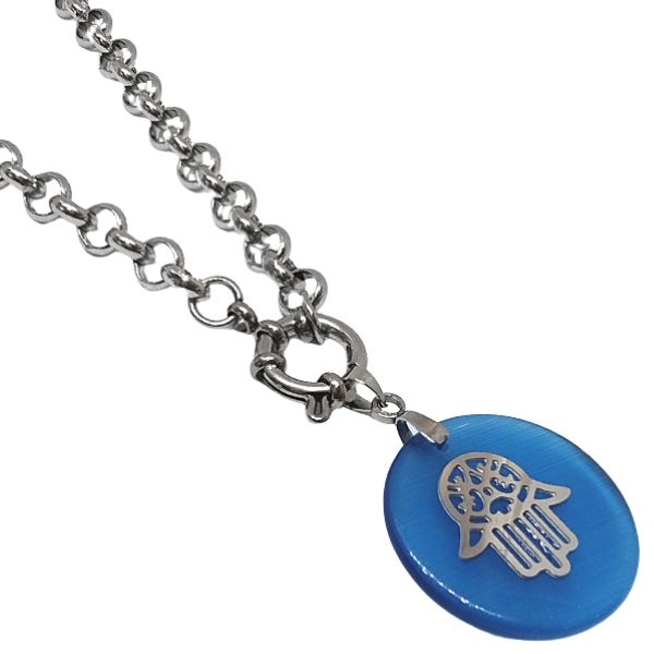 CONJUNTO Cadena rolo 6mm 45cm c/marinero y Dije de Resina Azul Con Mano de Fátima Alt: 36mm incl. drop de acero quirúrgico