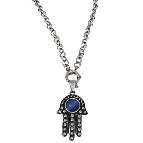 - CONJUNTO Cadena rolo 6mm 45cm c/marinero y Dije Mano de Fátima Con Esmalte y Piedra Resina Azul Alt: 42mm incl. drop de acero quirúrgico -OFERTA-