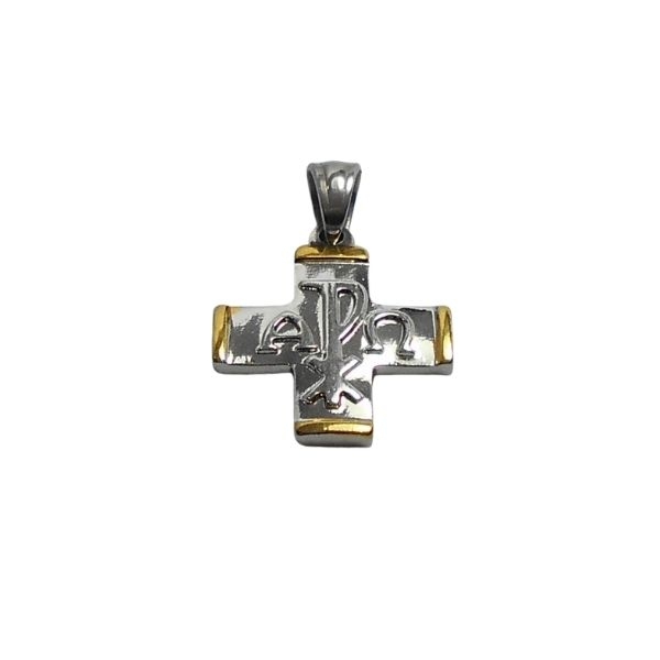 Dije cruz Crismón Alfa y Omega con dorado de acero quirúrgico Alt: 30mm incl. argolla