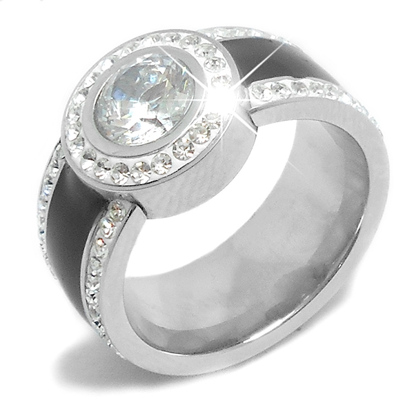 Anillo esmaltado negro con cubics blancos de acero quirúrgico Alt. 10mm