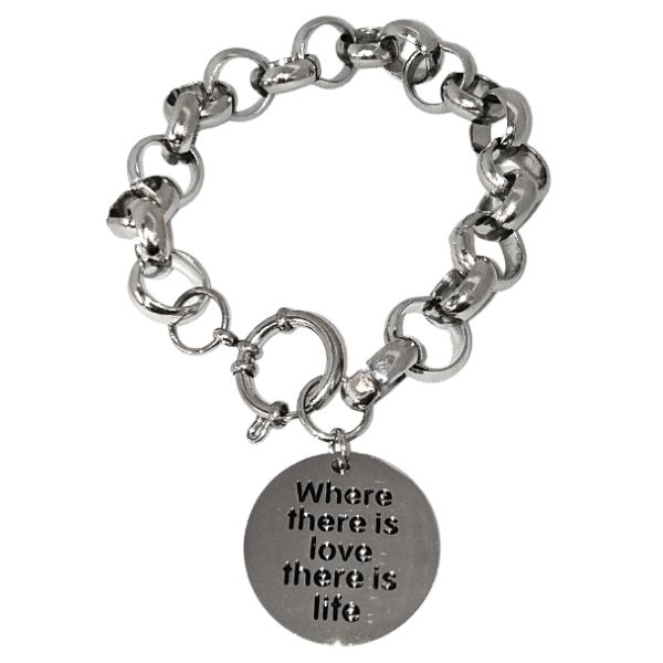 Pulsera rolo 12mm x 21cm con cierre marinero y Dije frase "Where there is love, there is life" Alt. 25mm de acero quirúrgico