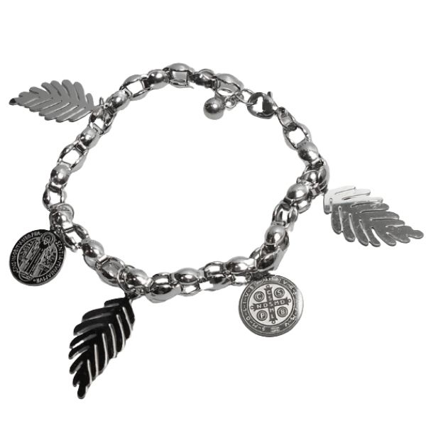 Pulsera con dijes San Benito y Hojas de acero quirúrgico