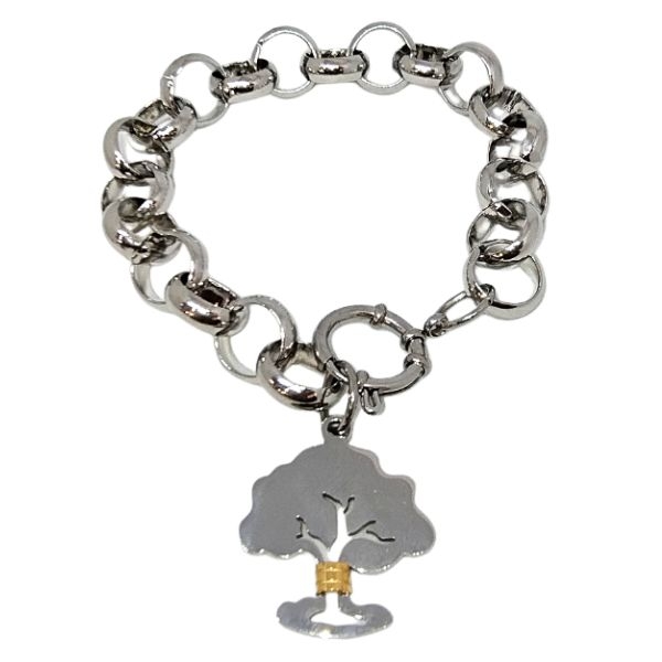 - Pulsera rolo 12mm x 21cm con cierre marinero y Dije Árbol de la Vida con aplique dorado Alt: 45mm de acero quirúrgico -OFERTA-